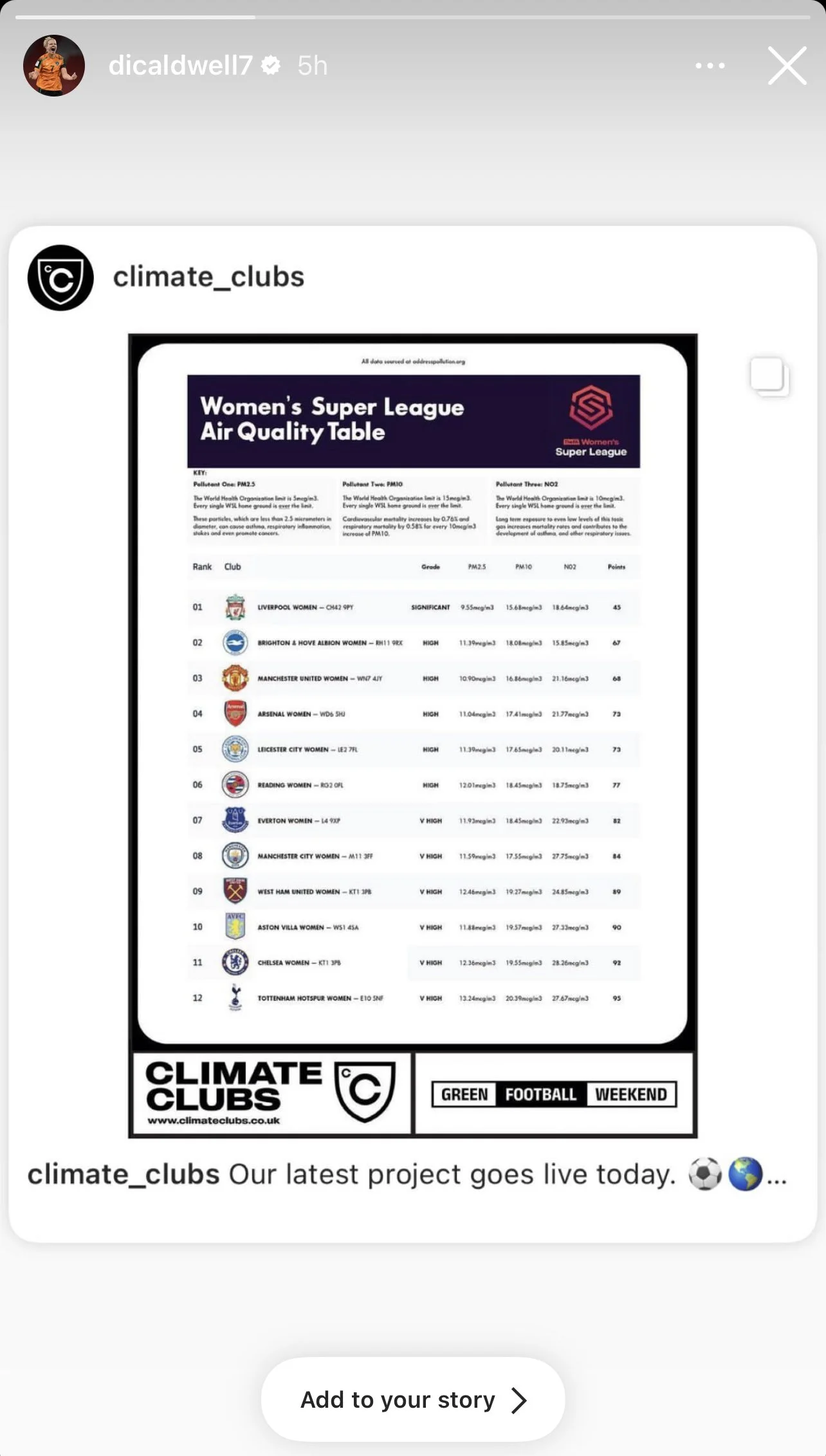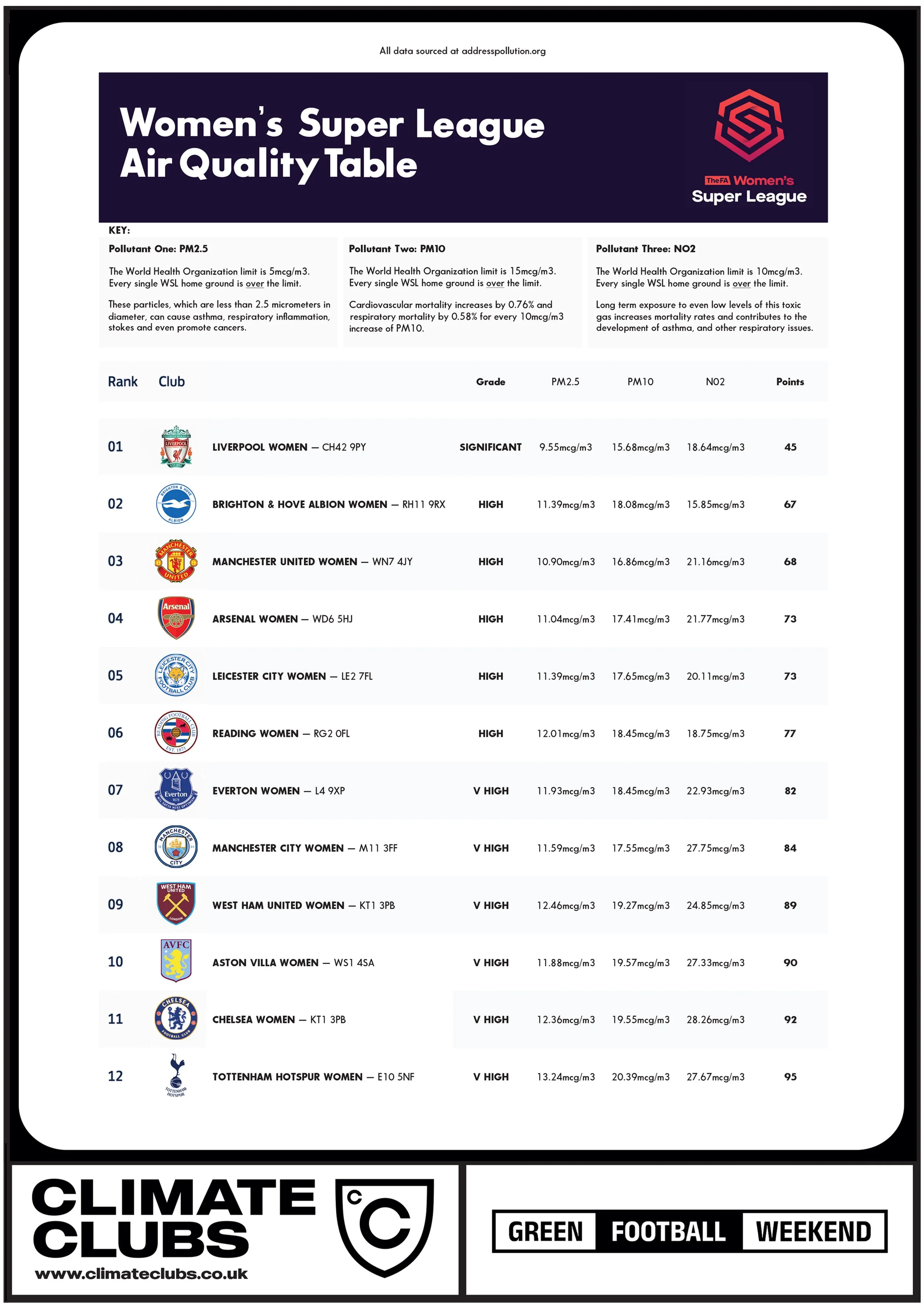 Diane Caldwell of Reading and Ireland gave us her thoughts: "It's scary to see the results of the Air Pollution WSL League Table and that every single WSL stadium is over The World Health Organisation's recommended limit for three toxic pollutants.""